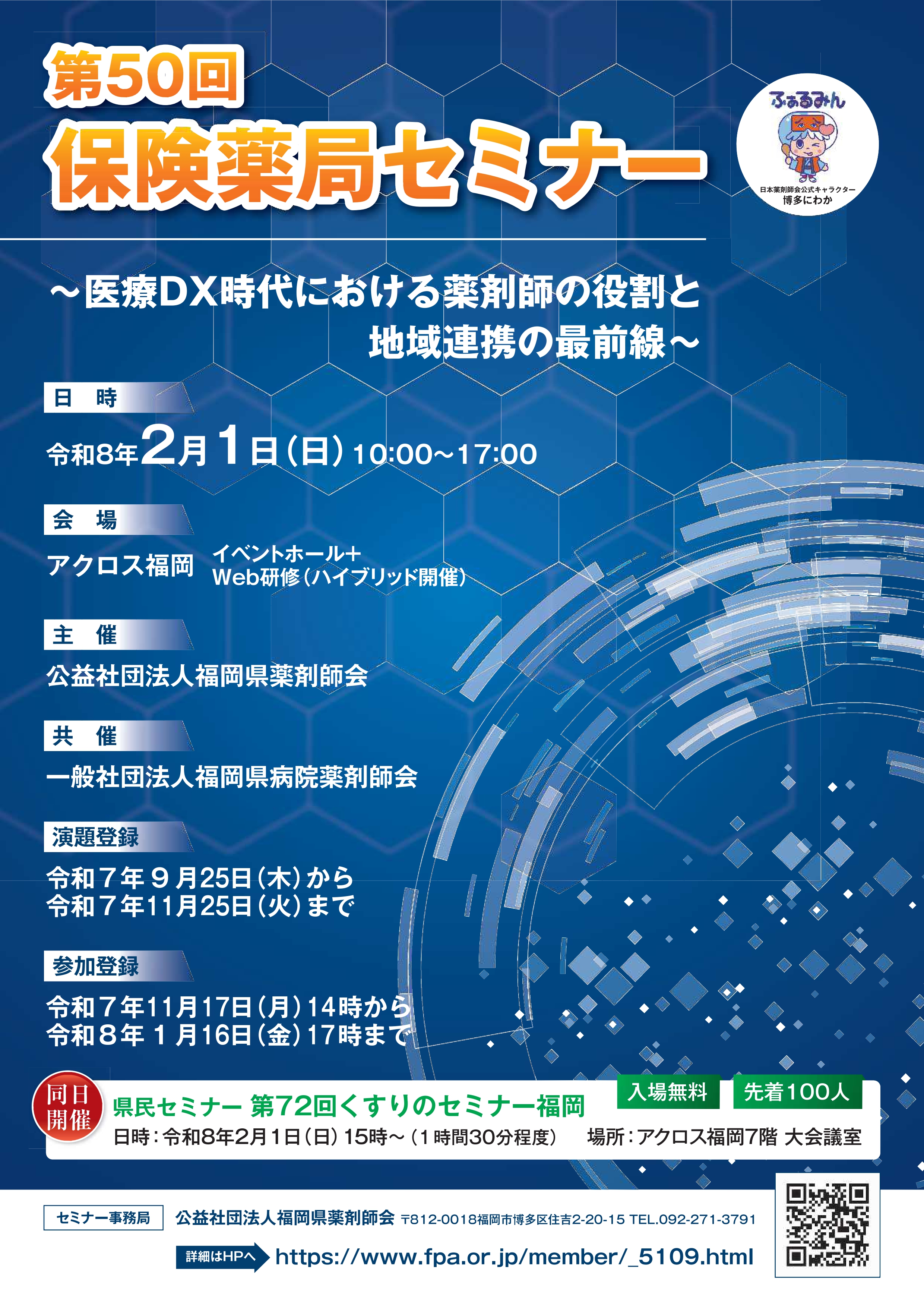 今般、従来別途開催しておりました「福岡県薬剤師会学術大会」と本セミナーを統合し、より充実した内容を備えた新たな形のセミナーとして、下記のとおり開催する運びとなりましたのでご案内申し上げます。
